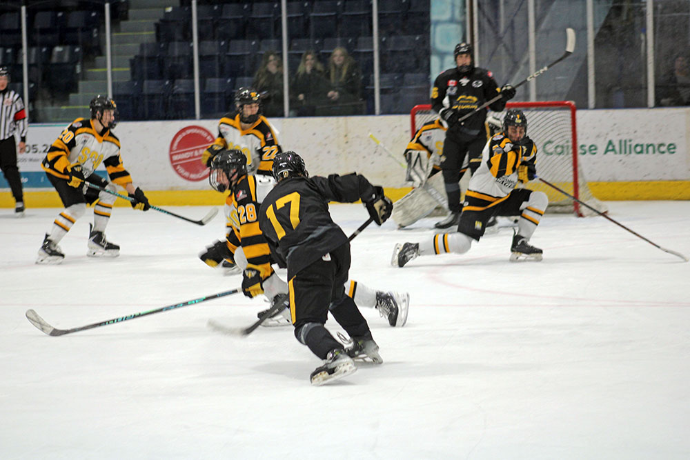 The hosts then took a 3-0 lead into the intermission when Alexandre St. Pierre swatted in a loose puck off a spinning Michael Karadinovic chance from the slot.