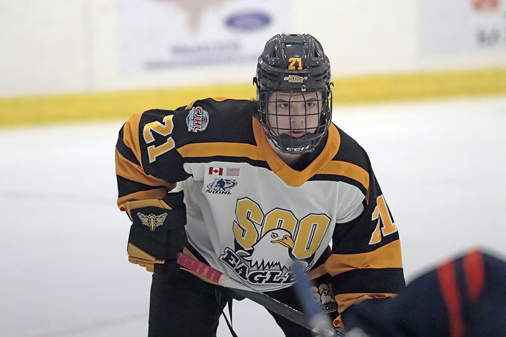 SAULT STE. MARIE, Mich. – An Anden Marceau hat trick, including the game-winner late in the final frame, lifted the Soo Eagles to a 5-2 triumph over the Soo Thunderbirds Saturday in a Northern Ontario Junior Hockey League cross-border affair at Pullar Stadium.