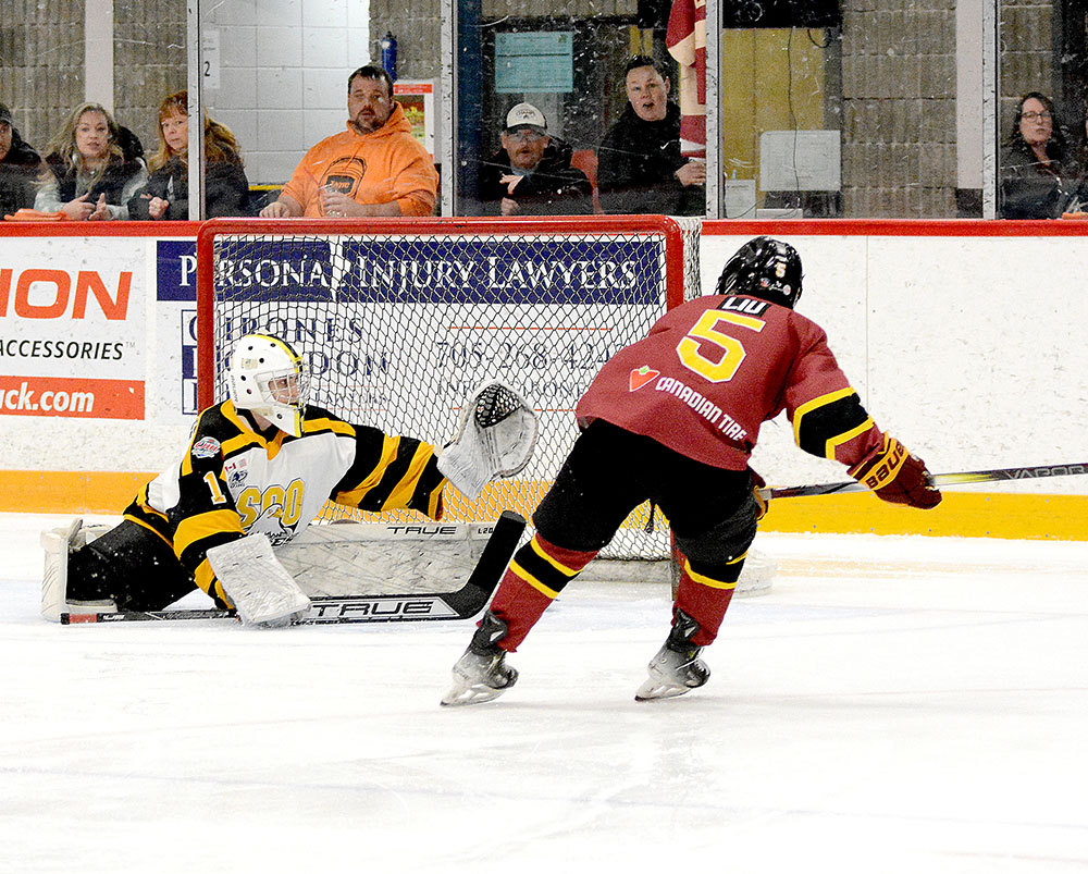 With Burkes on the bench for an extra attacker in the late going, the Soo pushed to pull closer, but the Rock’s Reece Liu picked off a play in his own zone before racing down and finishing off the win with an empty netter in the final minute.