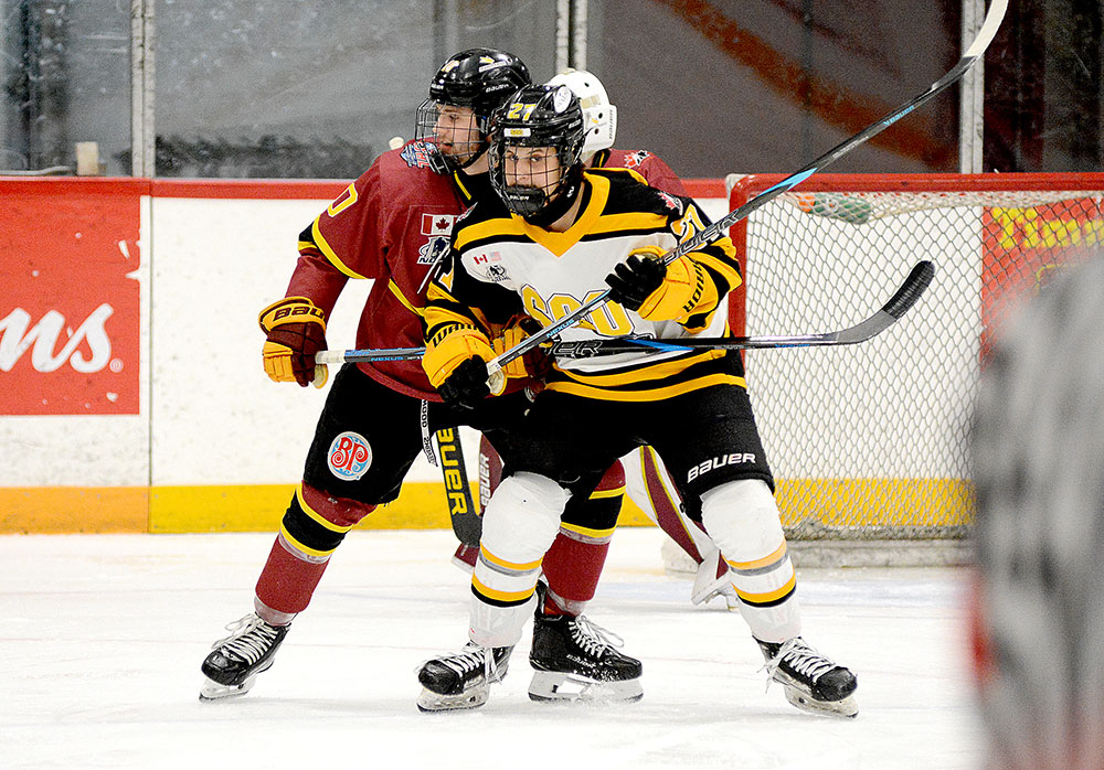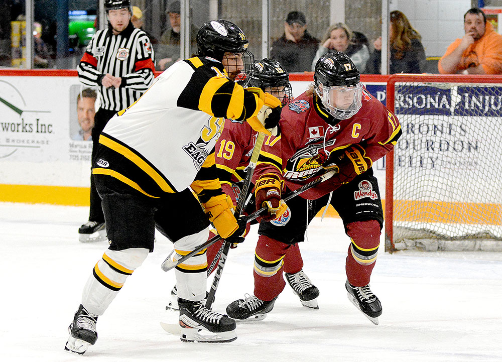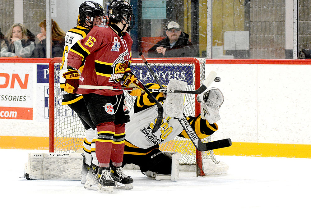 TIMMINS, Ont. – A Brant Romaniuk man-advantage marker, late in the first period, held up as the game-winner as the Timmins Rock went on to top the Soo Eagles 4-1 Saturday to begin their Northern Ontario Junior Hockey League quarter-final match-up at McIntyre Arena.