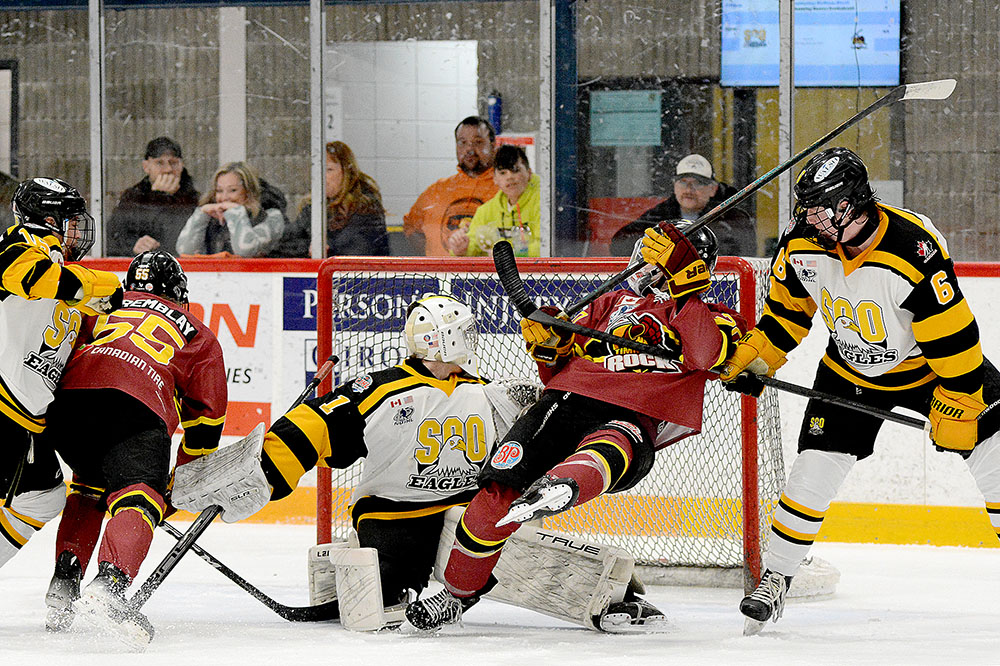 Cutting into the deficit while up a skater themselves, the Eagles’ Tyler Fortson put his team on the board by pumping one top shelf from the back of the right circle, high over the blocker of Rock netminder Dryden Riley, four and a half minutes into the second stanza.