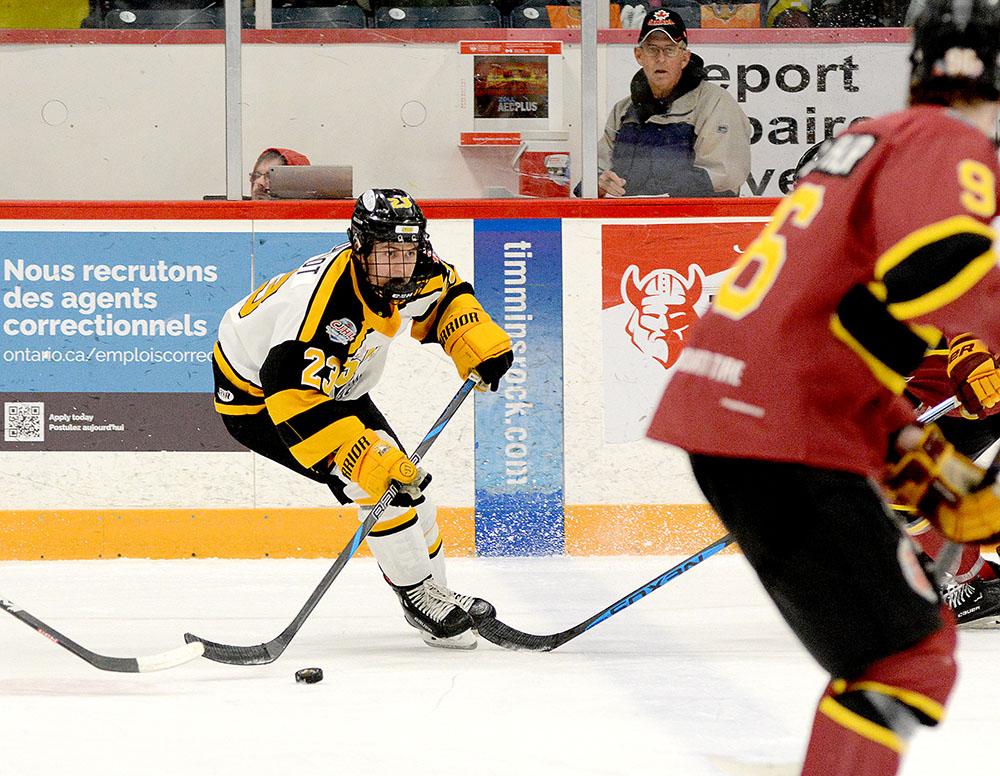 Regaining their multi-marker cushion just over five minutes into the third, Timmins’ Jack Kelly corralled a bouncing puck in front of the crease, then while spinning, sent it into bottom left corner.